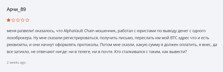 Жалобы на вывод средств Одной из самых распространённых проблем среди пользователей AlphaVault Chain является невозможность вывести средства. Многие инвесторы сообщают, что после того как они перевели криптовалюту на платформу, средства остались «зависшими» и не могли быть выведены.