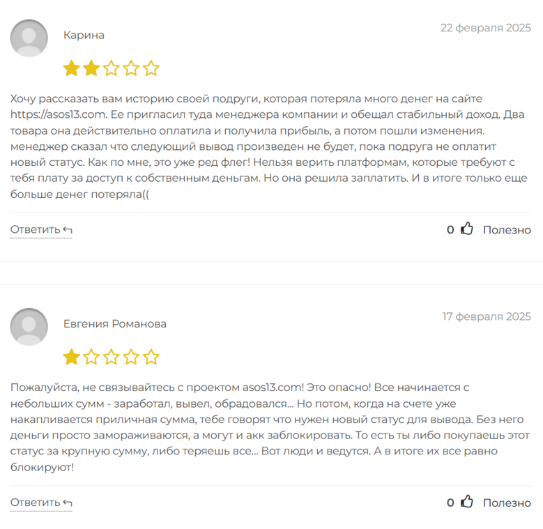 Множество клиентов, ставших жертвами Asos13, делятся своими отзывами и жалобами на различных форумах и платформах, посвященных мошенничествам. Люди жалуются на потерю больших сумм, которые были вложены в проект с надеждой на получение прибыли. После того как они осознали, что это обман, вернуть деньги оказалось невозможно.