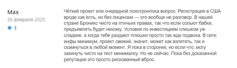 Неясность регистрации. Проект заявляет, что зарегистрирован как юридическое лицо Bronix Digital Assets LLC. Однако регистрация компании в США сама по себе не является гарантией её законности или добросовестности. Некоторые мошеннические платформы используют такие регистрации для создания видимости законной деятельности, при этом их действия могут быть далеки от реальной торговли и инвестиций.