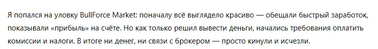 В интернете уже немало отзывов от людей, которые столкнулись с BullForce Market. Все они сходятся в одном: вывести деньги невозможно.