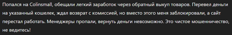 Colinsmall — это не просто некачественный проект. Это тщательно выстроенная схема обмана, в которой каждый элемент направлен на то, чтобы выманить как можно больше денег у клиента и оставить его без возможности защиты.