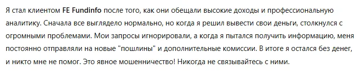 Отзывы пострадавших клиентов являются важным индикатором того, что брокер FE Fundinfo может заниматься мошенничеством. Большинство отзывов содержат жалобы на невозможность вывести средства, ошибки на платформе, а также нечестность компании в процессе взаимодействия с пользователями.