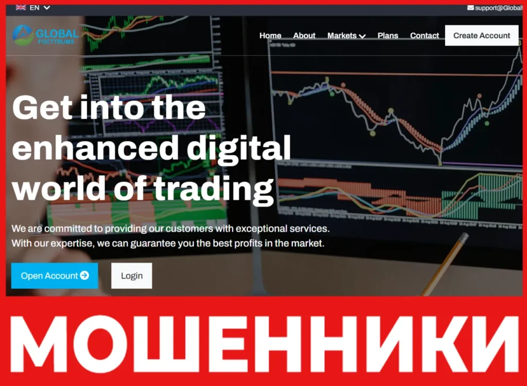 Globalfocttrums позиционирует себя как современный брокер с широким спектром торговых инструментов. На сайте компании можно найти обещания о высоких доходах, быстром открытии счета и поддержке клиентов 24/7. Они активно рекламируют собственные платформы для торговли акциями, валютой, криптовалютой и другими активами.