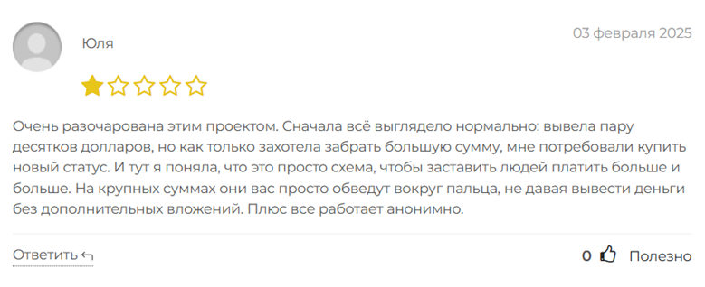 Многие пользователи сообщают, что после регистрации их приглашают на выполнение низкооплачиваемых заданий, а затем настоятельно рекомендуют перейти на более высокие уровни, заплатив дополнительные деньги. Когда они начинают осознавать, что в проекте нет реальной прибыли, и пытаются вывести деньги, то сталкиваются с различными препятствиями — от длительного ожидания выплат до полного игнорирования запросов.