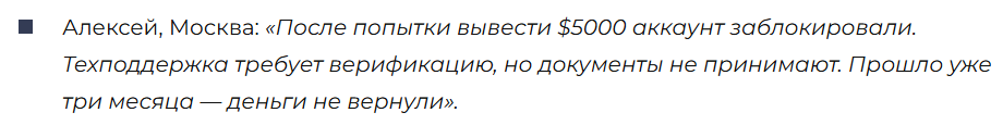 Когда трейдеры пытаются вывести свои средства, сталкиваются с проблемой: вывод средств либо задерживается, либо вообще не осуществляется. При этом сотрудники поддержки начинают игнорировать запросы, а контактные данные, указанные на сайте, оказываются недействительными.