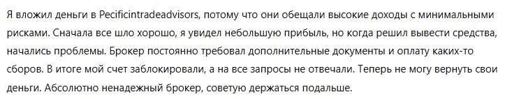 Отзывы пострадавших клиентов Pecificintradeadvisors подтверждают все опасения относительно мошенничества. Многие трейдеры жалуются на проблемы с выводом средств, блокировку аккаунтов и отсутствие ответа со стороны службы поддержки. Кроме того, пострадавшие клиенты рассказывают о том, как их заманивали обещаниями высокой прибыли и безрисковой торговли, а затем, когда они начали вкладывать деньги, брокер просто игнорировал все запросы и не позволял вывести средства.