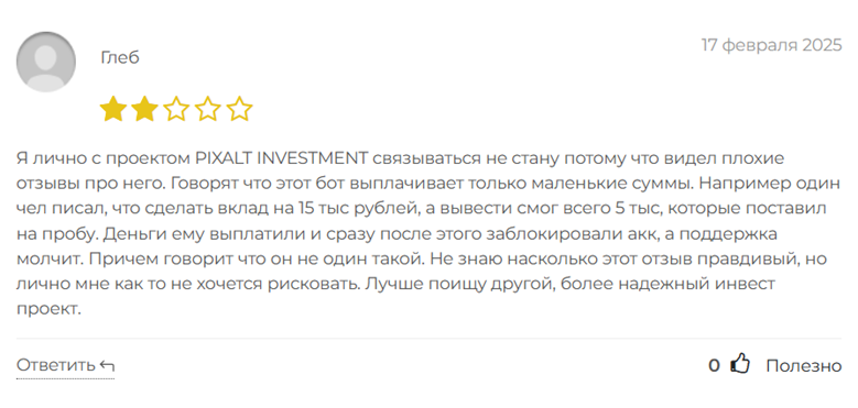 Отсутствие отзывов или их подделка. На большинстве мошеннических проектов сложно найти объективные отзывы. В случае с PIXALT INVESTMENT отзывы, которые появляются на платформе, скорее всего, поддельные, так как они пытаются создать иллюзию реальных успешных инвесторов. Это может быть еще одним явным признаком того, что проект не является легитимным.