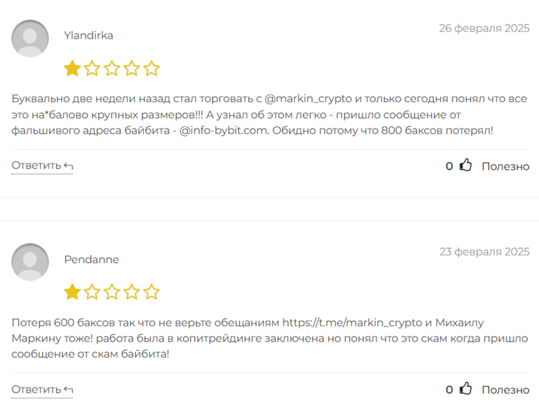 Отзывы от клиентов, пострадавших от мошенничества с Telegram-каналом Михаила Маркина, в основном являются отрицательными. Люди сообщают, что внесли деньги, веря в обещания о высоких доходах, но так и не получили никакой прибыли.