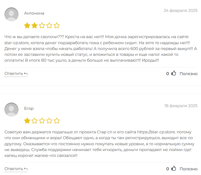 Многочисленные отзывы клиентов, которые стали жертвами Star Cp, подтверждают, что проект не является легитимным. Многие пользователи, которые вложили деньги в проект, заявляют о том, что им не были возвращены деньги, а также что обещания по высокому доходу так и не были выполнены.