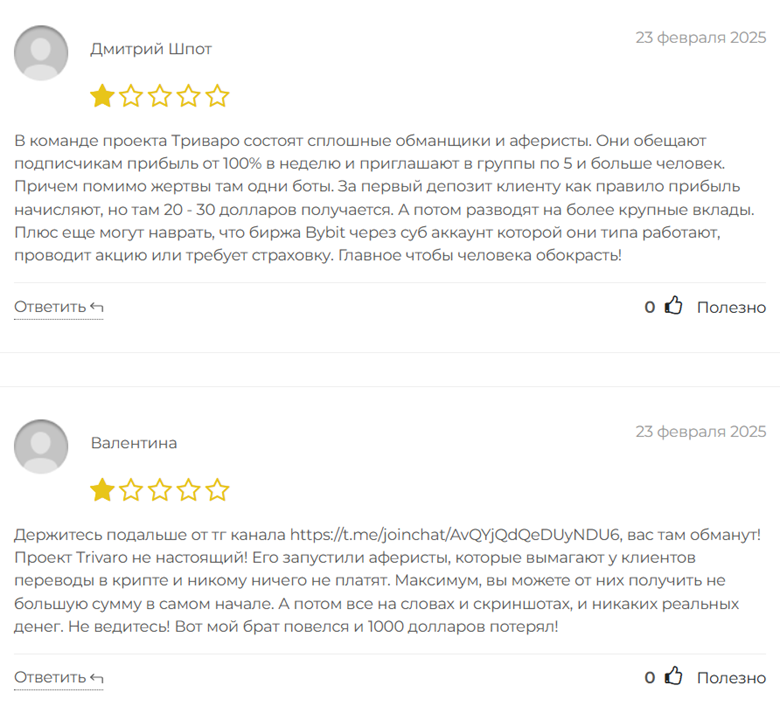 Отзывы о проекте Trivaro среди клиентов часто противоположны и порой противоречат обещаниям канала. Многие пользователи сообщают о том, что после внесения депозита не смогли вывести средства с платформы или столкнулись с огромными комиссиями при попытке забрать свой доход.