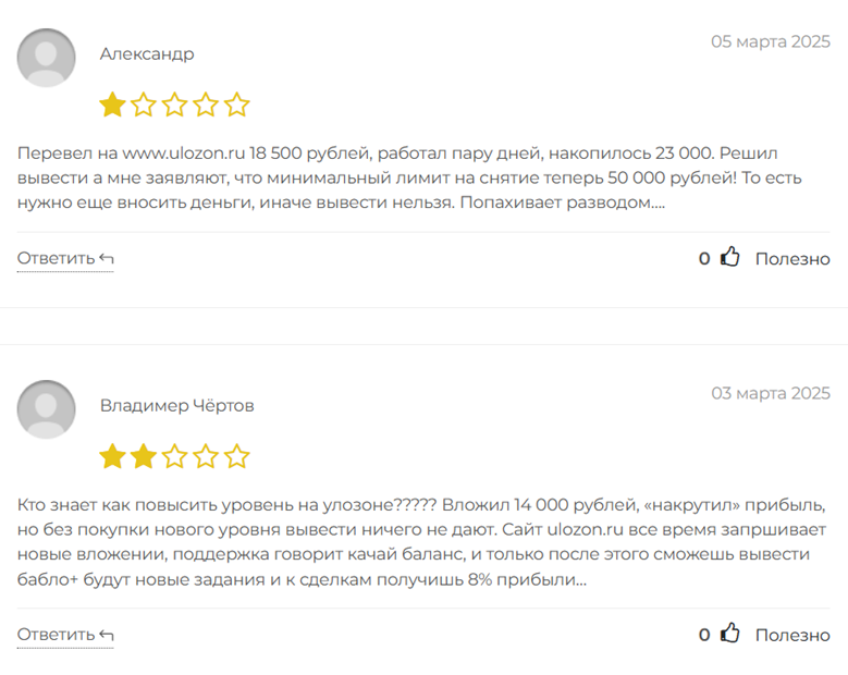 Отзывы о компании Ulozon в интернете, как правило, содержат предупреждения о её мошеннической деятельности. Пострадавшие пользователи сообщают о том, что были обмануты ложными обещаниями высокой прибыли и потратили деньги на повышение своего VIP-статуса, не получив ничего взамен.