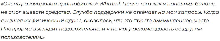 Контактные данные и поддержка. Платформа Whmml предоставляет контактные данные, однако они вызывают сомнения. На момент анализа пользователи сообщают о том, что техподдержка биржи не отвечает на запросы. Также указанный на сайте адрес не существует, что является признаком ненадежности. Отсутствие реальной поддержки — это тревожный сигнал для трейдеров, которые могут столкнуться с проблемами при выводе средств или техническими неполадками.